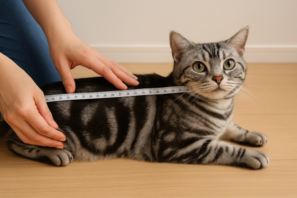 柔らかい布製のメジャーを猫の背中に沿わせて測ると正確です。猫が嫌がる場合は、壁際に座らせてしっかり伸びた状態で測る方法もあります。 - 定期的に記録する
