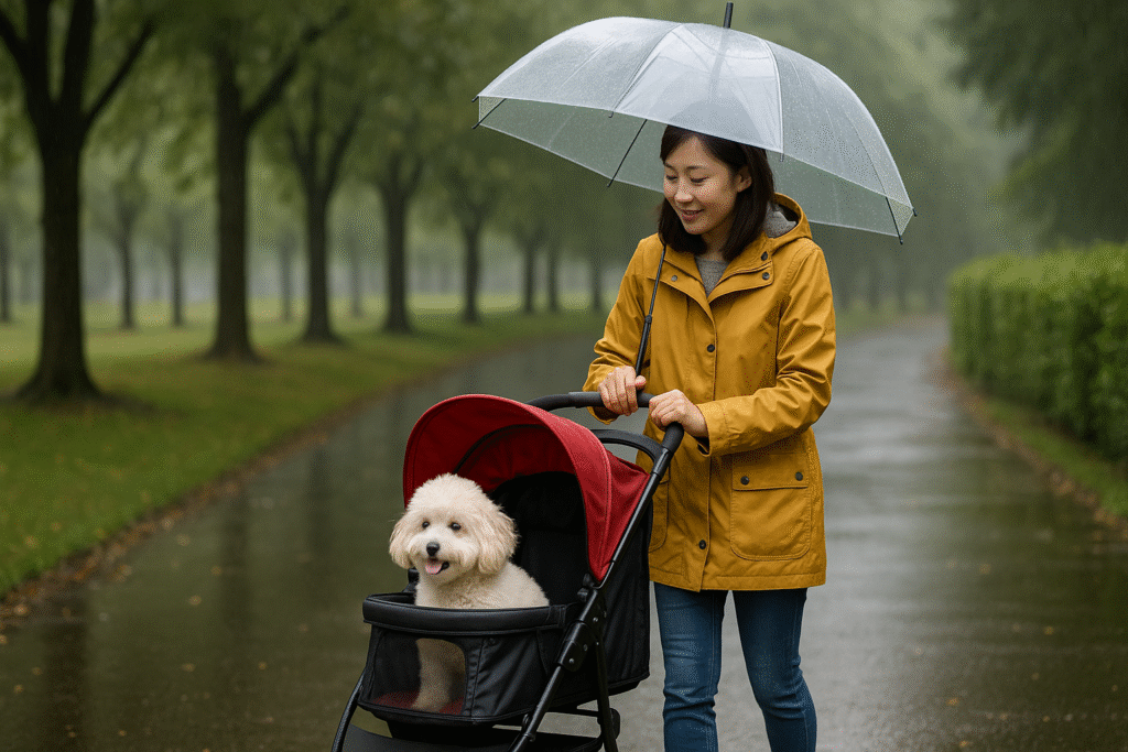 老犬は特に濡れた体が冷えやすいため、「雨の日だから散歩行かない」と切り捨てるのではなく、バギーを使った散歩で外の空気に触れさせてあげると良い刺激になります。