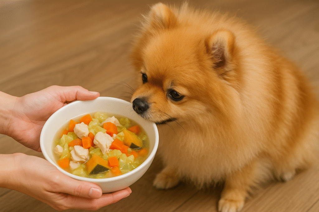 野菜と肉を煮込んだスープは十分に旨味が出ており、これだけで犬は満足します。