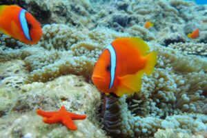 クマノミはオレンジと白の鮮やかな体色が特徴の海水魚で、イソギンチャクと共生することで知られています。比較的丈夫で飼育しやすく、海水魚水槽の入門種として人気があります。