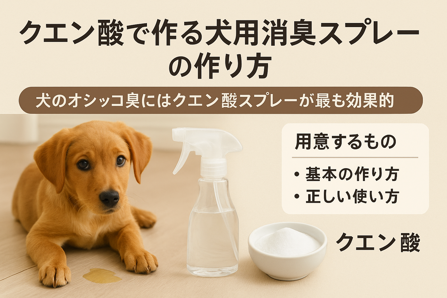 犬のオシッコ臭がなかなか取れない…。 そんな時に役立つのが、クエン酸で作る手作りの消臭スプレーです。 自然成分で安心して使えるうえ、オシッコ臭の原因であるアンモニアをしっかり中和してくれるため、市販のスプレーに頼らず自宅ですぐ対策できます。... -