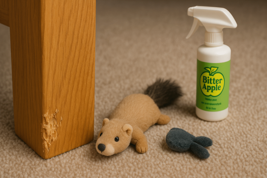 - 物を噛む場合は、「ビターアップル」を吹きかけるのも効果的